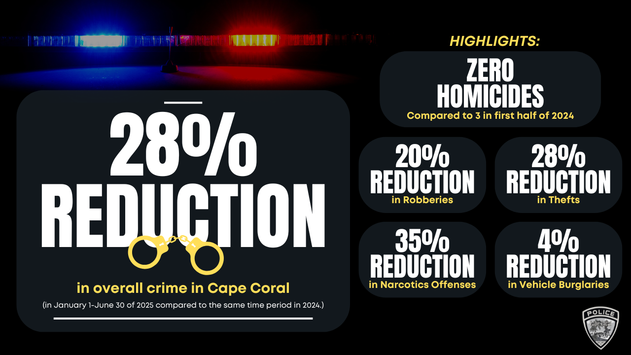 The Cape Coral Police Department is proud to announce a remarkable 28% overall reduction in crime during the first half of 2025, compared to the same period last year. This achievement reflects more than just numbers—it is a clear testament to the hard work and unwavering commitment of our dedicated officers, the support and vigilance of our community, and our department’s ongoing investment in innovative, data-driven policing.