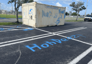 On Saturday, July 19, 2025, at approximately 5:00 PM, officers responded to the Cape Coral Sports Complex, located at 1410 Sports Boulevard, Cape Coral, regarding criminal mischief. Extensive graffiti in blue spray paint was discovered on a portable storage unit, a trash can, multiple areas of the parking lot, and cement blocks at the baseball fields. The estimated cost for cleanup and repair for this property damage was calculated at $1,342.60.